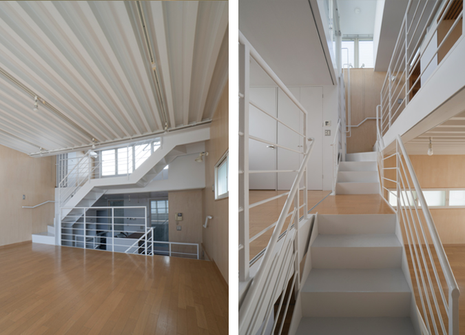 すべてのレベルから、半階上と下のレベルが見え、また、半階上の窓の先の空に視線が抜けるつくりとし、視覚的広がりで、39平米という建築面積の小ささを感じさせないようにした。