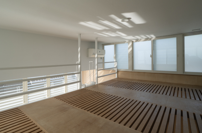 2階のロフト(竣工時は子供室の就寝スペース)。すの子は、竣工時に子供たちの布団がむれないようにしたため。改修により、窓は内窓を付け、2重窓となっている。
