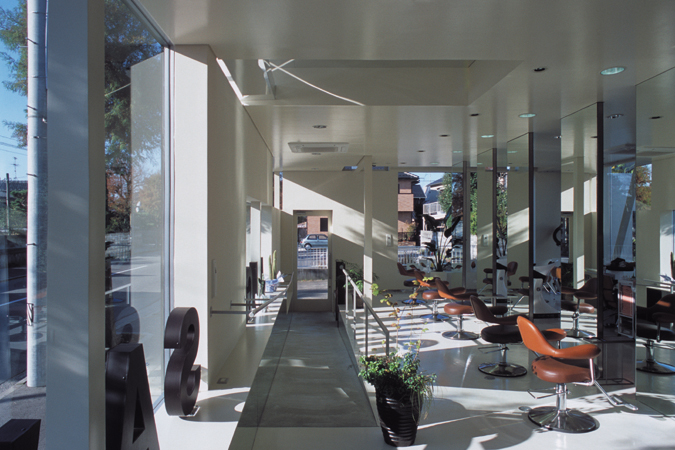 改装に際し、美容院に付き物の「鏡」を積極的に利用し、単純な空間に複雑さを持ち込み、室内と屋外を近づけようとしました。