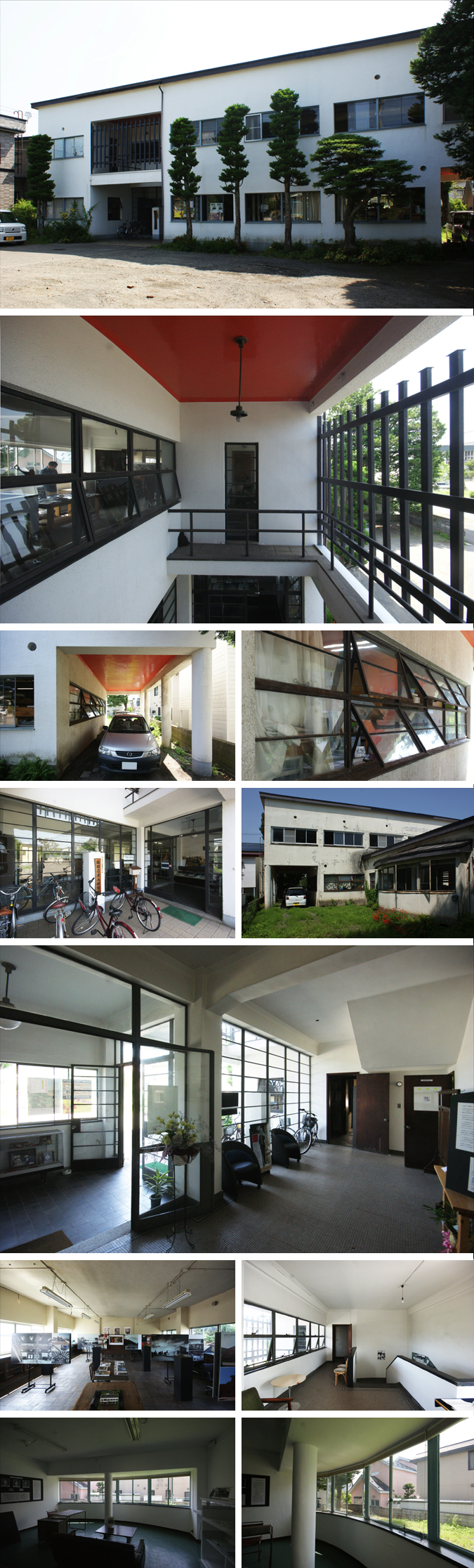建物の正面は、2階建の箱型で細長く伸び、真っ白な外観、ピロティ、水平な窓など、いかにもモダニズムらしいボキャブラリーに溢れています。昼間は影となり、近づくまでは気が付きませんが、玄関の吹抜や車寄せの天井に塗られた朱色が鮮やかです。西欧で学んだ建築家が、習い立てのモダニズムの理論を、そのまま生硬に形にしたようなところが、若々しく、今も、魅力的です。