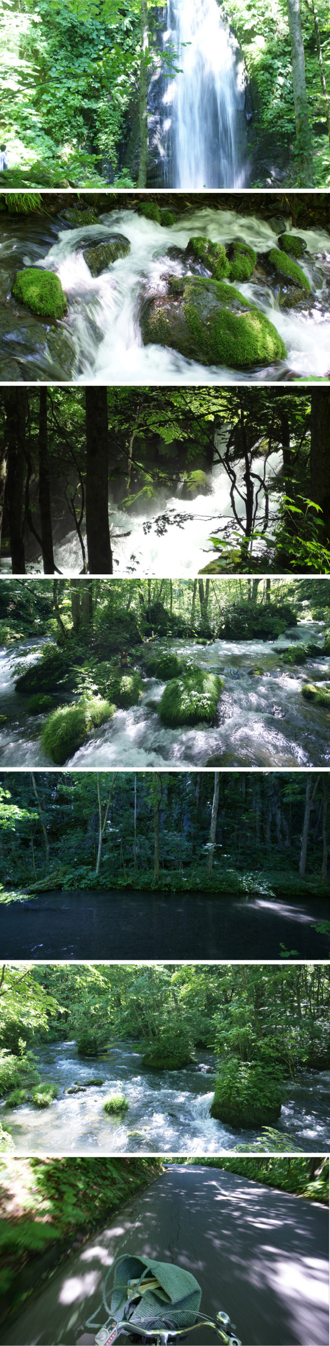 「雲井の滝」から「九十九島」を経て「阿修羅の流れ」までが、苔むした岩と白糸のような流れがつくる奥入瀬のハイライトです。流れは、幾重にも枝分かれしては一つになり、浮島のような小岩や中州を白く包んで行きます。6月半ば、植物は、すでに育ちすぎて、スケールが生々しく見える部分があるものの、時には、大海の荒波に浮かぶ小島そのものに見えて来ます。