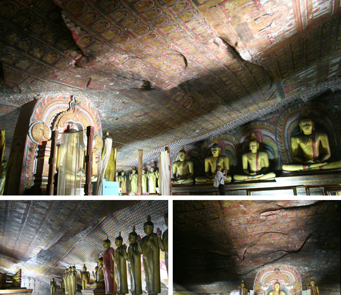 もともとは、修行僧の住む洞窟でしたが、タミール人に都アヌラーダプラを追われた王をかくまい、助けたことから、王が、アヌラーダプラ奪還後、感謝の念で、石窟内部をつくったそうです。第1窟、第2窟、第4窟がそれにあたり、紀元前1世紀のことです。それ以来、2000年にわたり、時の王の力で整備され、18世紀には第3窟、1915年には第5窟も加わりました。壁画は、色褪せれば塗り直されたため、創建当時のものではなく、18世紀以降と考えられているそうです。