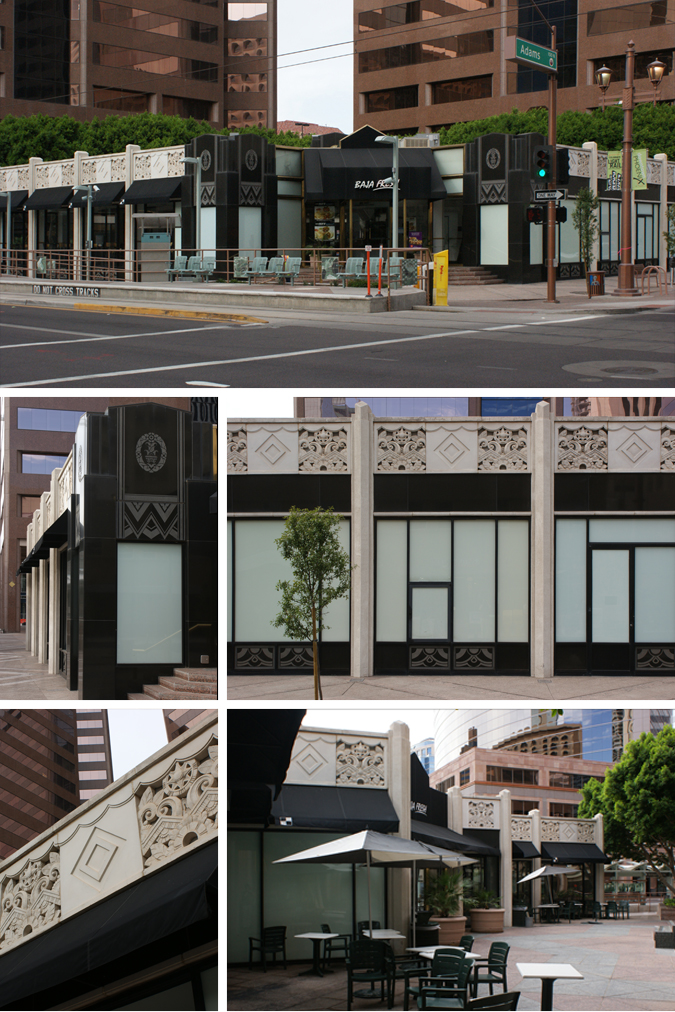 アメリカ・インディアンの壺にちなんだ黒御影石の文様や、白いマヤ風の浮彫に、プエブロ・デコの空気が漂いますが、ぱっと見には、フェニックスで、アールデコのスタイリッシュさを、いちばん感じました。