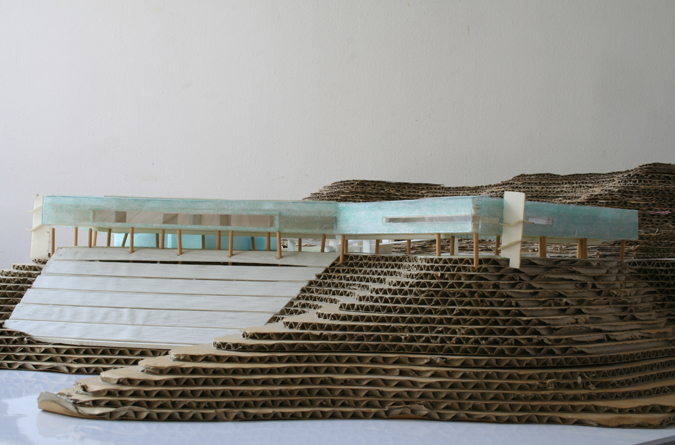 The view from above. The museum is disposed along the terrain and the slope passages connect the road side with the museum.