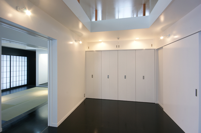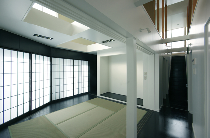 On the ceiling above the loft, the lights of each room that leaks from the openings are reflected and the sound of the activity is transmitted dimly. Family's sign mixes indirectly at the height of the loft, and a new type's communication that is different from the usual house with private room or the house of one big room type generates. The sign is also overlapped with the sign of the family on the time according to the things put on the loft.