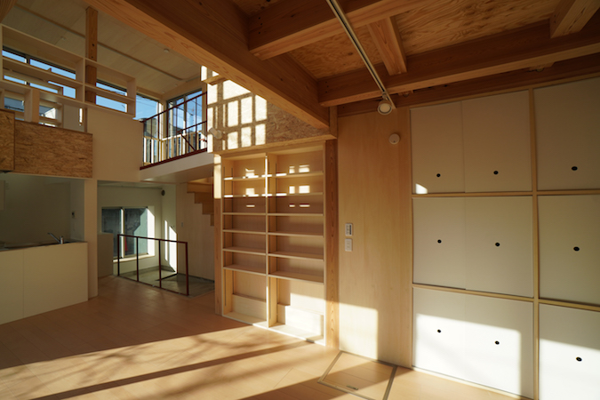 See the 2nd floor from the clothes-drying space. Light and shadow in the morning create a rich expression in the space. The desk space and sleeping space are in the back of the front across the bridge. On the right is the gallery with display shelves on both sides to decorate things with various memories. The interior finish is a combination of beach plywood as the main material and various materials and colors.