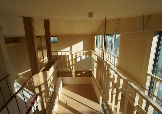 See the open ceiling space from the 2nd floor. Around the open ceiling space, the living room, kitchen, sleeping space, gallery, parallel bars space and clothes-drying space are disposed and the state of those activities creates a lively atmosphere in the room.